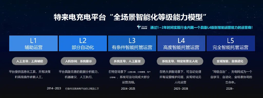 特來(lái)電定義了充電平臺(tái)L1-L5“全場(chǎng)景智能化等級(jí)能力模型”。行業(yè)內(nèi)主流充電平臺(tái)在L2級(jí)及以下,而特來(lái)電通過(guò)借助AI大模型,實(shí)現(xiàn)了L3(有條件智能托管運(yùn)營(yíng)),同時(shí)在新一代充電網(wǎng)數(shù)字化充電平臺(tái)下,通過(guò)1-2年時(shí)間將實(shí)現(xiàn)行業(yè)內(nèi)第一個(gè)具備L4級(jí)別智能運(yùn)營(yíng)能力,為客戶(hù)提供通往L5級(jí)無(wú)人值守運(yùn)營(yíng)的最優(yōu)路徑,線下場(chǎng)站全自動(dòng),線上運(yùn)營(yíng)全智能。