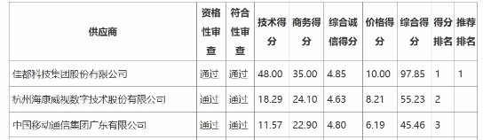 項目同時公示了其他投標人的信息,除了中標的佳都科技外,??低暭爸袊苿訌V東公司也有投標。