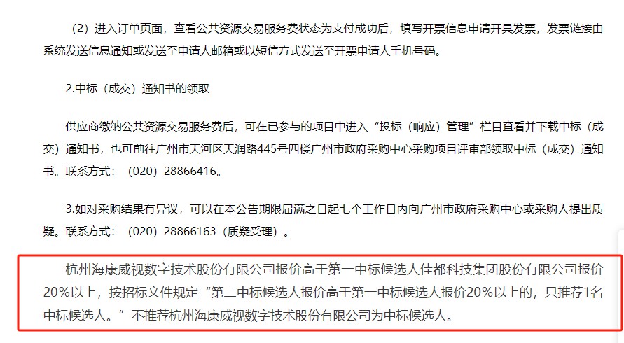 ??低暰C合得分排名第二。結(jié)果公告顯示,??低晥髢r高于第一中標候選人佳都科技報價20%以上,按招標文件規(guī)定“第二中標候選人報價高于第一中標候選人報價20%以上的,只推薦1名中標候選人?!辈煌扑]杭州??低晹?shù)字技術(shù)股份有限公司為中標候選人。