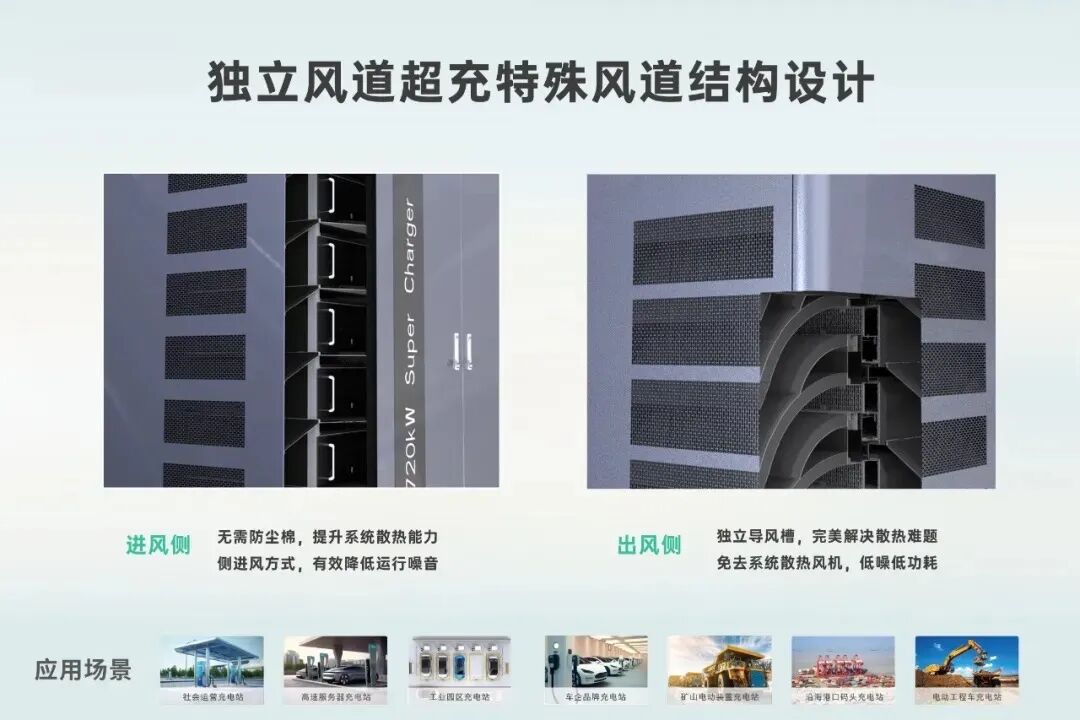 基于優(yōu)優(yōu)綠能40kW/60kW/125kW·IP65獨立風(fēng)道充電模塊的高防護(hù)、高效率、低噪音、免維護(hù)等特性,打造的獨立風(fēng)道兆瓦超充解決方案,可滿足城市公共充電、高速國道、礦廠工程等多種兆瓦超充應(yīng)用場景。方案設(shè)計了雙列橫向模塊擺放設(shè)計,結(jié)合獨特的風(fēng)道結(jié)構(gòu)設(shè)計,進(jìn)風(fēng)側(cè)無需防塵棉有效提升系統(tǒng)散熱能力,側(cè)進(jìn)風(fēng)可有效降低運(yùn)行噪音;出風(fēng)側(cè)采用了獨立導(dǎo)風(fēng)槽,免去系統(tǒng)散熱風(fēng)機(jī),進(jìn)一步解決散熱問題,又能同時降低噪音和降低系統(tǒng)功耗。