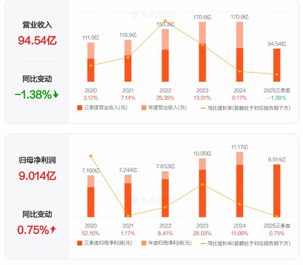 2025年前三季度公司實現(xiàn)營業(yè)總收入94.54億元,同比下降1.38%;歸母凈利潤9.01億元,同比增長0.75%