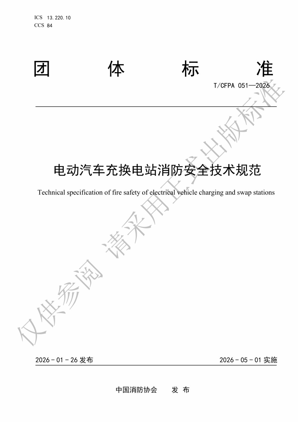 2026年1月27日,中國消防協(xié)會(huì)正式發(fā)布《電動(dòng)汽車充換電站消防安全技術(shù)規(guī)范》(T/CFPA 051-2026),該標(biāo)準(zhǔn)將于2026年5月1日起正式實(shí)施。