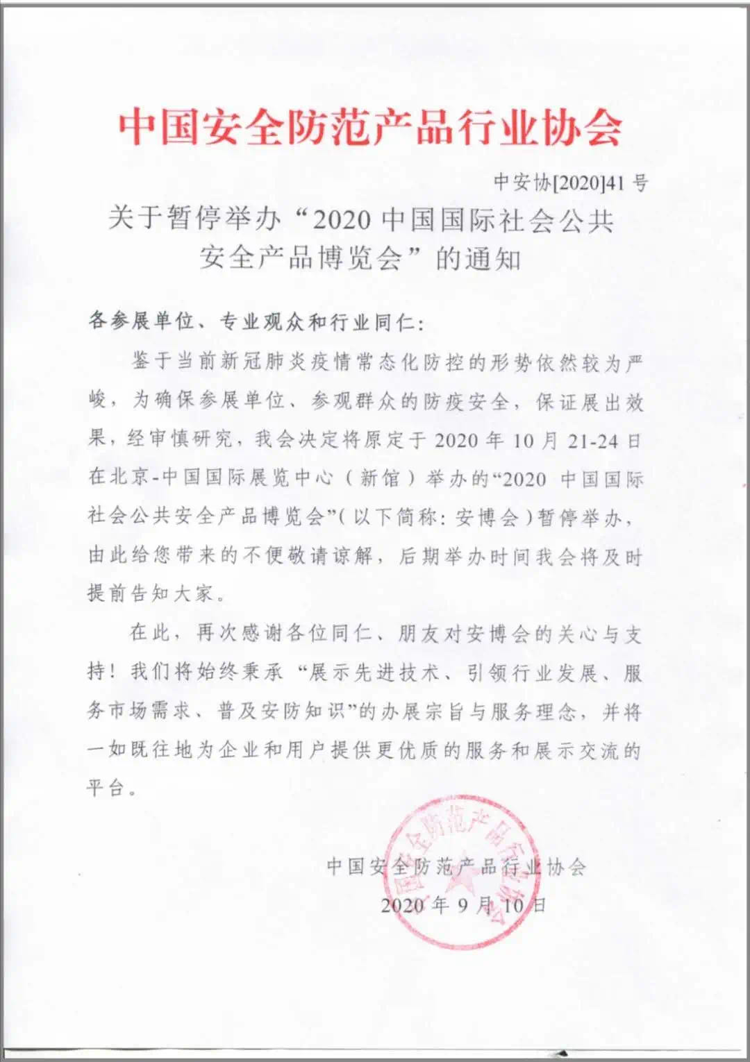 為確保參展單位、參觀群眾的防疫安全,保證展出效果,經(jīng)審慎研究,中國安全防范產(chǎn)品行業(yè)協(xié)會決定將原定于2020年10月21-24日舉辦的“2020中國國際社會公共安全產(chǎn)品博覽會”暫停舉辦。