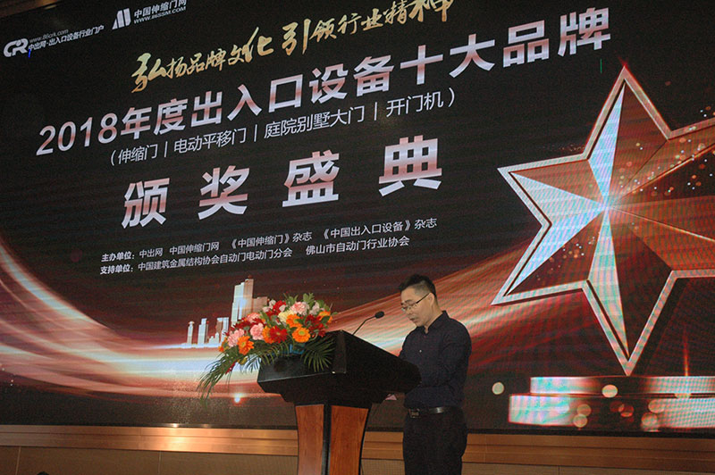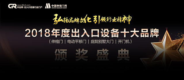 本次頒獎(jiǎng)典禮由中出網(wǎng)、中國伸縮門網(wǎng)、《中國出入口設(shè)備》雜志、《中國伸縮門》雜志主辦,中國建筑金屬結(jié)構(gòu)協(xié)會自動門電動門分會潘冠軍會長、林夕范副會長、佛山市自動門行業(yè)協(xié)會羅明輝會長、陳標(biāo)明榮譽(yù)會長、李乾峰榮譽(yù)會長、邱新和榮譽(yù)會長、朱宜文榮譽(yù)會長以及獲得十大品牌的各企業(yè)代表等200人出席此次頒獎(jiǎng)活動。本次頒發(fā)的是2018年度出入口設(shè)備行業(yè)中的四個(gè)品類十大品牌,分別是伸縮門、電動平移門、庭院別墅大門、開門機(jī)。