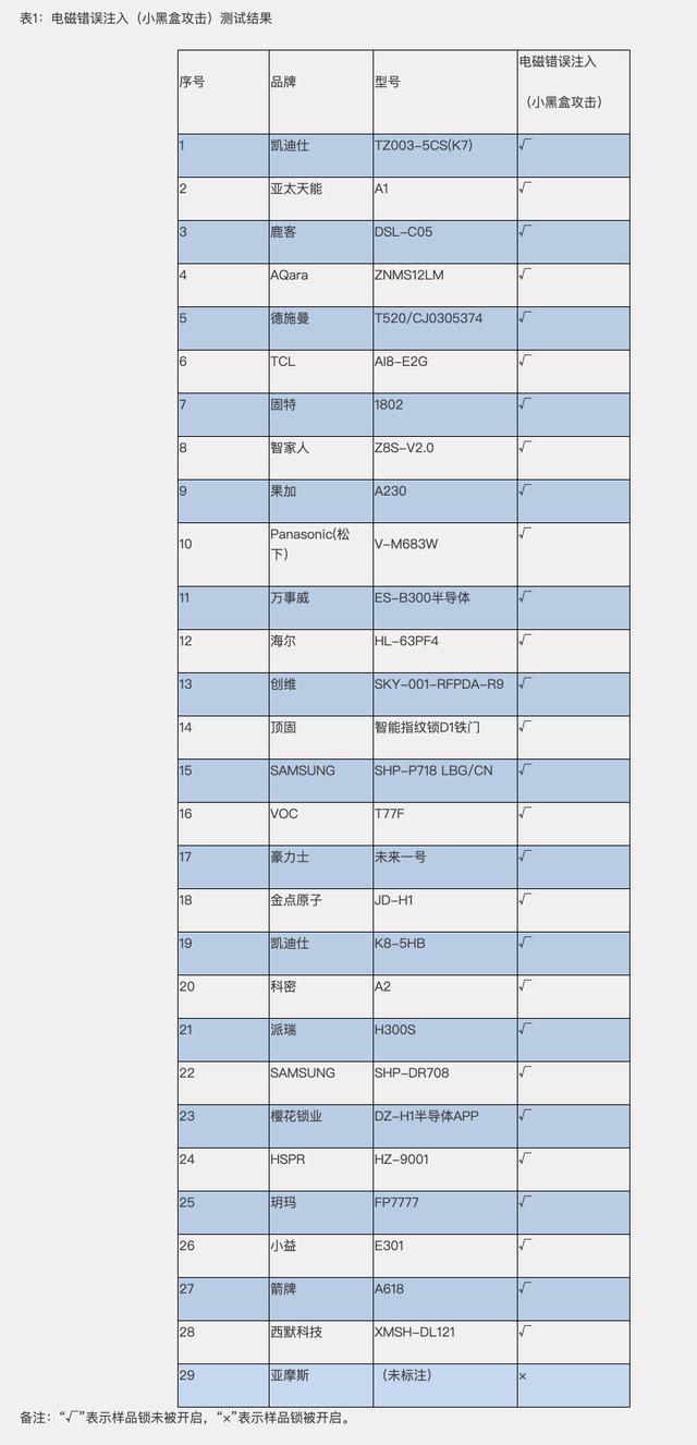 網(wǎng)上流傳的“小黑盒秒開(kāi)智能門鎖”傳聞讓很多選擇了智能門鎖的用戶開(kāi)始提心吊膽起來(lái)。而為了驗(yàn)證這個(gè)傳聞,中國(guó)消費(fèi)者協(xié)會(huì)聯(lián)合四川、深圳、佛山消費(fèi)者委員會(huì)對(duì)29款智能門鎖樣品進(jìn)行了比較試驗(yàn)。并公布了29款智能鎖比較試驗(yàn)結(jié)果,其中,有28款小黑盒攻擊后未出現(xiàn)開(kāi)啟現(xiàn)象,僅1款無(wú)生產(chǎn)廠家信息標(biāo)注的樣品小黑盒攻擊后被打開(kāi)。