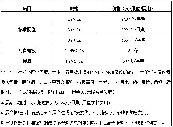 6、標準展位配備一張洽談桌,二把椅子,一個電源插座;★標準展位是由三面圍板圍成,圍板高度約2.5米,公司標牌(楣板)約高30公分、長3米;★特展展位不包含標準展位的任何設施?!锪硗庑鑼拵ЬW線、租用桌子、椅子、射燈、貨柜等,請現(xiàn)場與濟南國際會展中心現(xiàn)場服務部聯(lián)系(現(xiàn)場租賃,不預約);
