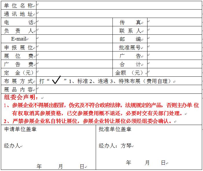 1、請(qǐng)參展企業(yè)認(rèn)真填寫申請(qǐng)表各項(xiàng)內(nèi)容,保證內(nèi)容的詳細(xì)真實(shí)有效,加蓋公章后,郵寄或傳真至大會(huì)組委會(huì),申請(qǐng)被接受后,大會(huì)組委會(huì)通過(guò)傳真或郵寄確認(rèn)您的申請(qǐng);