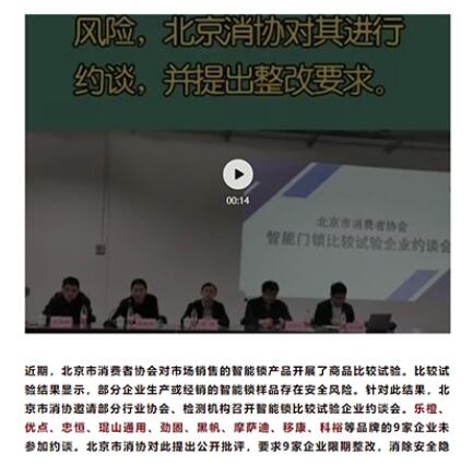 針對(duì)此結(jié)果,北京市消協(xié)邀請(qǐng)部分行業(yè)協(xié)會(huì)、檢測(cè)機(jī)構(gòu)召開智能鎖比較試驗(yàn)企業(yè)約談會(huì)。樂(lè)橙、優(yōu)點(diǎn)、忠恒、琨山通用、勁固、黑帆、摩薩迪、移康、科裕等品牌的9家企業(yè)未參加約談。