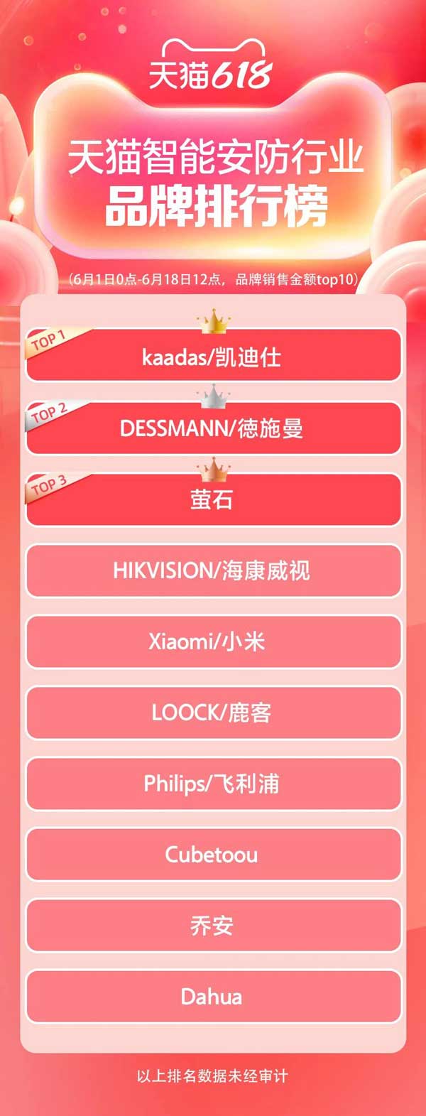 來自天貓數(shù)據(jù)的品牌排行榜顯示,凱迪仕、德施曼、螢石、??低?、小米、鹿客、飛利浦、Cubetoou、喬安、Dahua等品牌銷售金額TOP10。其中,來自凱迪仕的官方消息,天貓店成為618活動智能鎖行業(yè)首個破億的品牌。