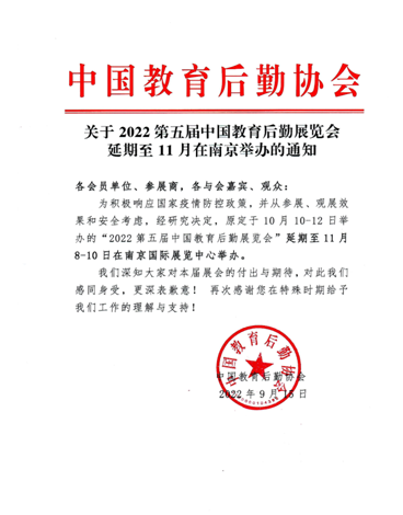 為積極響應(yīng)國(guó)家疫情防控政策,并從參展、觀展效果和安全考慮,經(jīng)研究決定,原定于10月10-12日舉辦的“2022第五屆中國(guó)教育后勤展覽會(huì)”延期至11月8-10日在南京國(guó)際展覽中心舉辦。