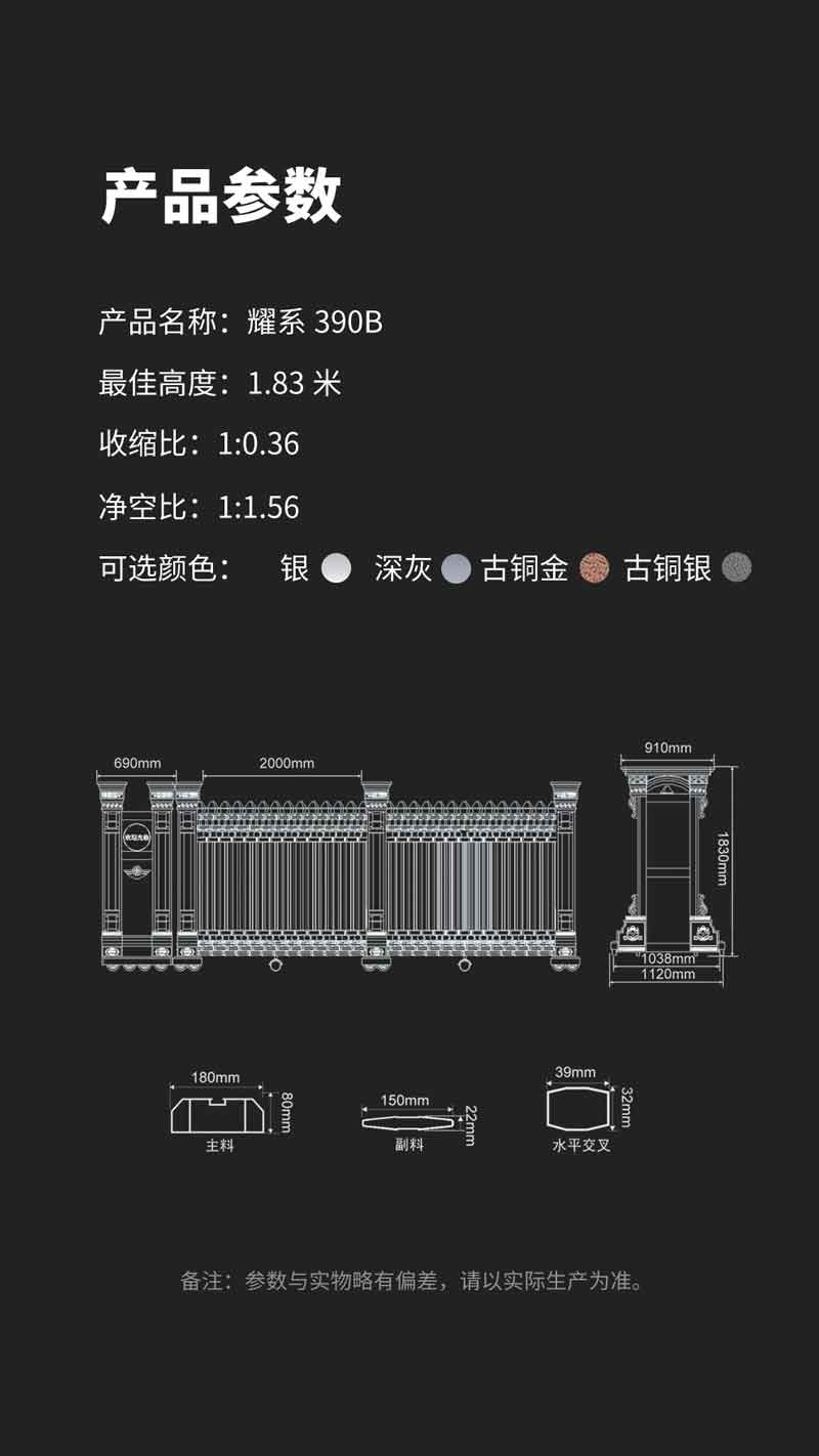 溫馨提醒:選購鋁合金伸縮門-耀系390B產(chǎn)品,請仔細(xì)瀏覽本頁面。如您還有疑問,請撥打服務(wù)電話,我們將免費為您提供鋁合金伸縮門-耀系390B的款式、價格、生產(chǎn)廠家、安裝維修等方面的咨詢服務(wù)。
