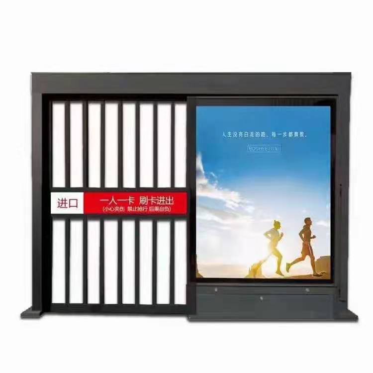 廣告平移門,2.6—3.2米可選,帶有廣告位,可盈利,安裝于小區(qū)人行通道口,搭配安裝人臉識別或讀卡方式,實現(xiàn)業(yè)主自由通行,也可有效防止外來陌生人員進入,安全性高。