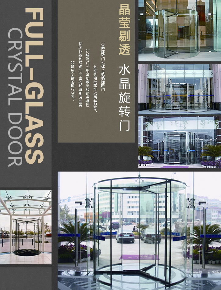 溫馨提醒:選購水晶旋轉(zhuǎn)門產(chǎn)品,請仔細瀏覽本頁面。如您還有疑問,請撥打服務(wù)電話,我們將免費為您提供水晶旋轉(zhuǎn)門的款式、價格、生產(chǎn)廠家、安裝維修等方面的咨詢服務(wù)。