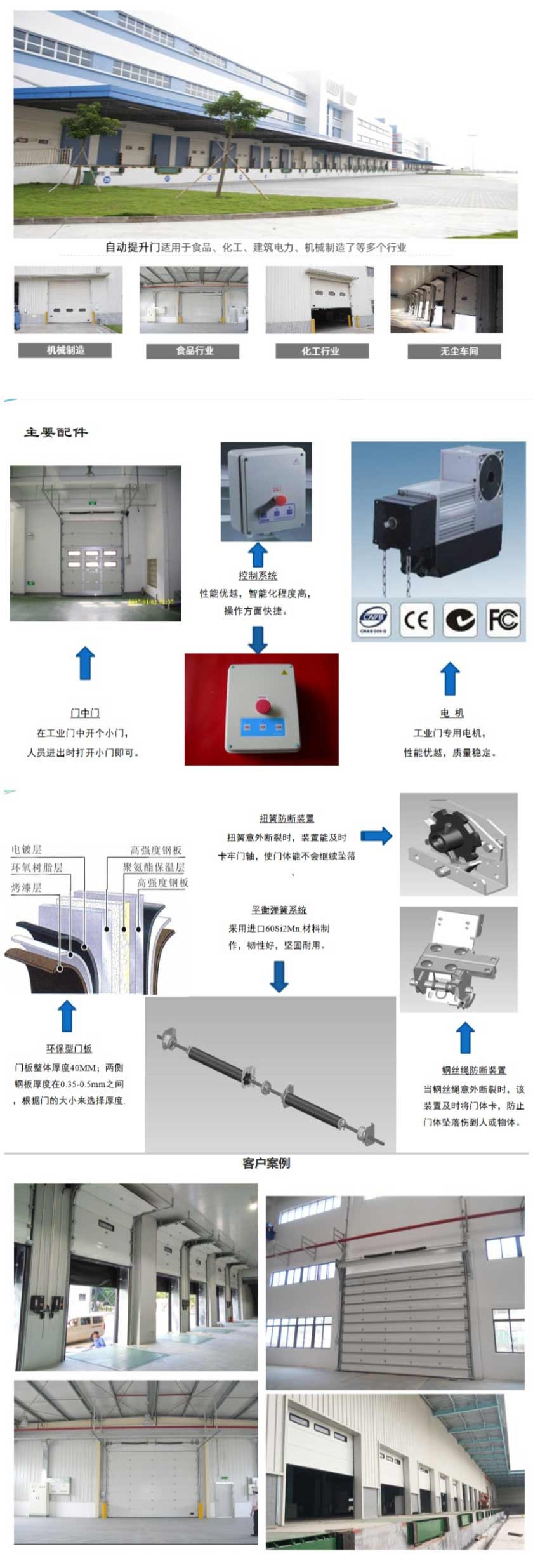 應用場所:自動提升門適用于大型倉庫、物流行業(yè)、醫(yī)藥、食品、廠礦企業(yè)等對于開啟速度,保溫,隔音,密封,抗風等要求比較高的行業(yè)。尤其是門洞較大,不便安裝地面門體的地方起到方便、快捷開啟作用。