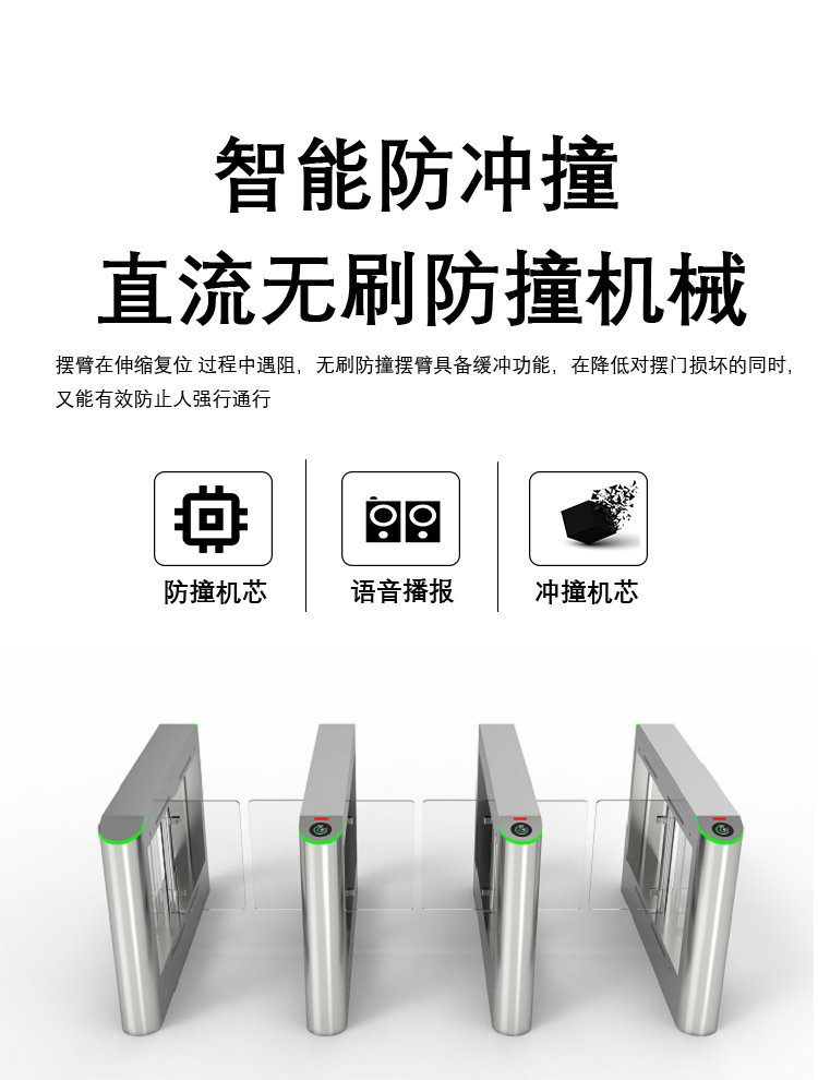 機(jī)械防撞設(shè)計(jì):閘擺采用柔性材料(如聚氨酯)或彈性結(jié)構(gòu),受到外力撞擊時(shí)可緩沖卸力,減少設(shè)備損壞和行人受傷風(fēng)險(xiǎn)。