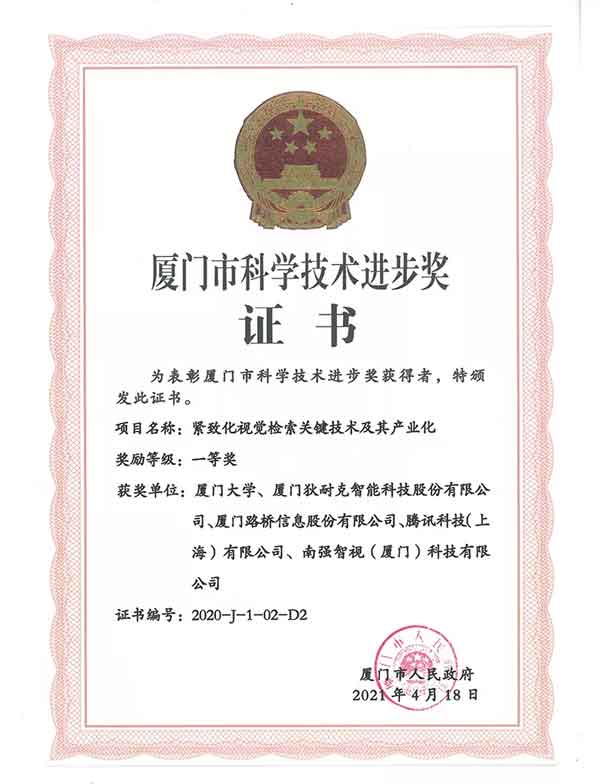 "緊致化視覺檢索關(guān)鍵技術(shù)"項(xiàng)目榮獲“2020年度廈門市科學(xué)技術(shù)進(jìn)步一等獎(jiǎng)”。該獲獎(jiǎng)項(xiàng)目由廈門大學(xué)與廈門狄耐克智能科技股份有限公司、廈門路橋信息股份有限公司、騰訊科技(上海)有限公司、南強(qiáng)智視(廈門)科技有限公司等單位共同完成。