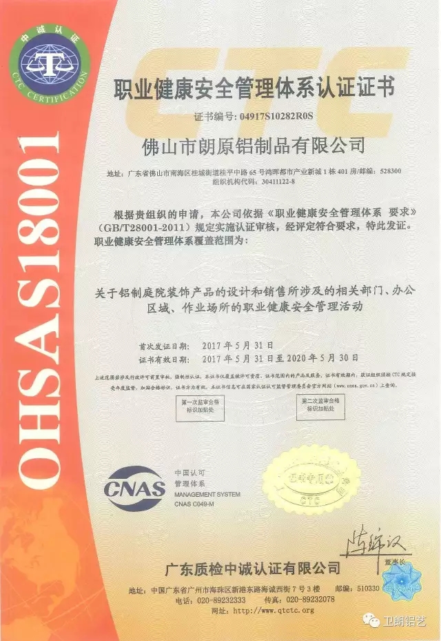 目前,我公司擁有ISO9001質(zhì)量管理體系、OHSAS18001職業(yè)健康安全管理體系、ISO14001環(huán)境管理體系三大管理體系的認(rèn)證證書(shū),完成了三證合一的體系認(rèn)證。