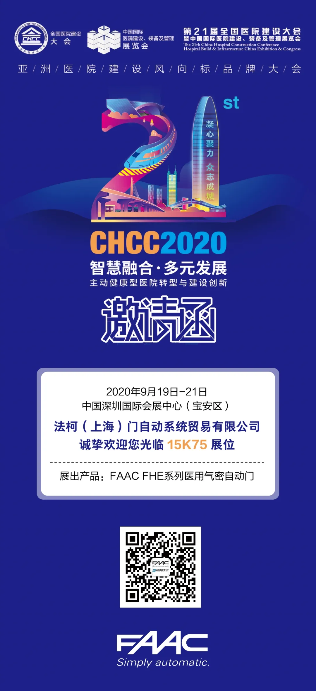 2020年是不平凡的一年,疫情突襲、舉國(guó)抗疫,醫(yī)護(hù)人員與醫(yī)院建設(shè)者們逆風(fēng)而行,在抗擊疫情中做出了巨大貢獻(xiàn),也創(chuàng)造了諸多“奇跡”。FAAC密切關(guān)注疫情發(fā)展的同時(shí),也用行動(dòng)踐行著企業(yè)責(zé)任。至此CHCC舉辦之際,F(xiàn)AAC攜全新升級(jí)的FHE系列醫(yī)用氣密自動(dòng)門亮相展會(huì)。我們誠(chéng)摯的邀請(qǐng)您蒞臨參會(huì),深入交流,共謀醫(yī)院建設(shè)新局面,共創(chuàng)智能服務(wù)新未來。