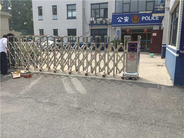 淮安伸縮門采用標(biāo)準(zhǔn)的鋁合金型材直接用模具壓制成型,然后通過鍍鋅管以及交叉連桿連接而成,材質(zhì)更優(yōu),造型更美觀,更加耐腐蝕,為淮安市公安局清河分局健康路派出所大門口增加色彩。