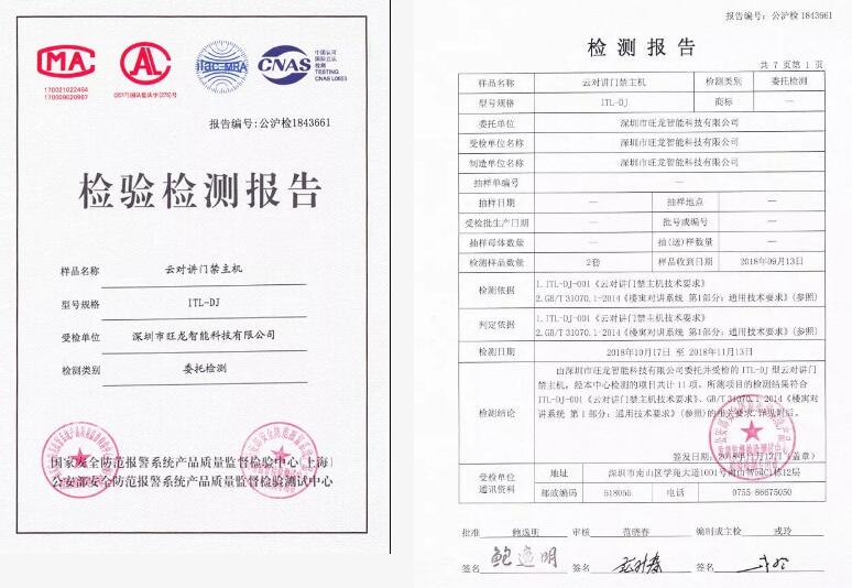 檢測結(jié)果1:由本中心抽樣,深圳市旺龍智能科技有限公司委托并受檢的ITL-DJ型云對(duì)講門禁主機(jī)樣品,經(jīng)本中心檢測的項(xiàng)目共計(jì)31項(xiàng)。所檢項(xiàng)目的檢測結(jié)果符合GA/T394.2002《 出入口控制系統(tǒng)技術(shù)要求》的相關(guān)要求。