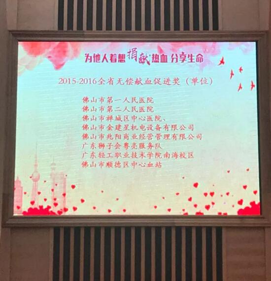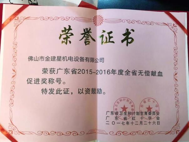 廣東省佛山市政府舉行了以“為他人著想,捐獻熱血,分享生命”為主題的世界獻血者日活動。活動上,黃董事長個人及公司榮獲無償獻血促進單位獎及個人無償獻血促進獎等多項獎項,建星智能科技有限公司連續(xù)八年,每年都自發(fā)組織無償獻血行動,黃錦山董事長以身作則,帶領(lǐng)著全公司員工及家人踴躍參與無償獻血行動。