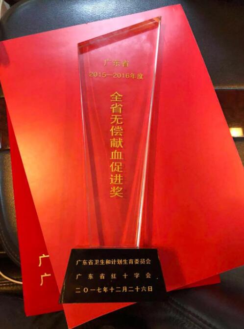 廣東省“2015-2016年度全省無償獻血促進獎”榮譽證書