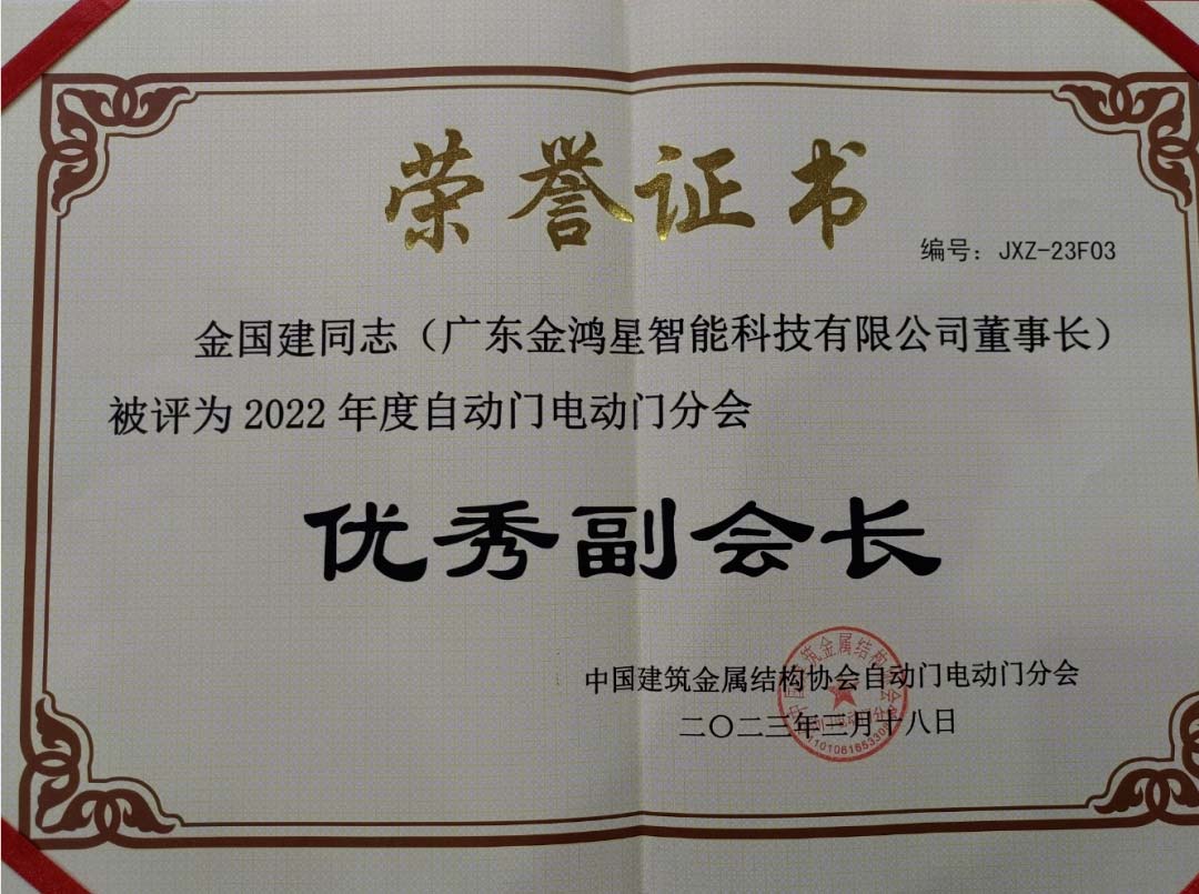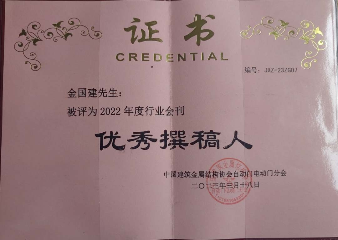 盛典現(xiàn)場(chǎng),廣東金鴻星智能科技有限公司董事長(zhǎng)金國(guó)建先生被聘為中國(guó)建筑金屬結(jié)構(gòu)協(xié)會(huì)技術(shù)顧問(wèn)并斬獲多項(xiàng)殊榮,其中獲評(píng)「2022年度自動(dòng)門電動(dòng)門分會(huì)優(yōu)秀副會(huì)長(zhǎng)」、「戶外人行智能平開(kāi)門參編單位」、「自動(dòng)門電動(dòng)門行業(yè)特別奉獻(xiàn)獎(jiǎng)」,金鴻星董事長(zhǎng)金國(guó)建榮膺「2022年度行業(yè)會(huì)刊優(yōu)秀撰稿人」稱號(hào),這些殊榮充分肯定了金鴻星在中國(guó)自動(dòng)門電動(dòng)門行業(yè)的卓越地位及深厚影響力。