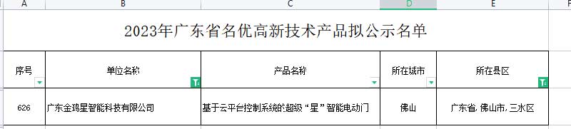 近日,廣東省高新技術(shù)企業(yè)協(xié)會(huì)公示了《2023年廣東省名優(yōu)高新技術(shù)產(chǎn)品擬通過名單》,廣東金鴻星智能科技有限公司研發(fā)的超級(jí)“星”智能電動(dòng)門產(chǎn)品憑借卓越的創(chuàng)新和優(yōu)異的性能,成功入選目錄名單。
