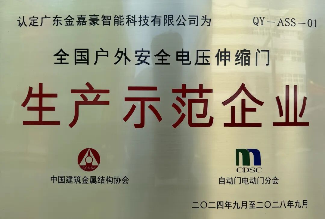 祝賀廣東金嘉豪智能科技有限公司獲得“全國戶外安全電壓伸縮門生產(chǎn)示范企業(yè)”認證