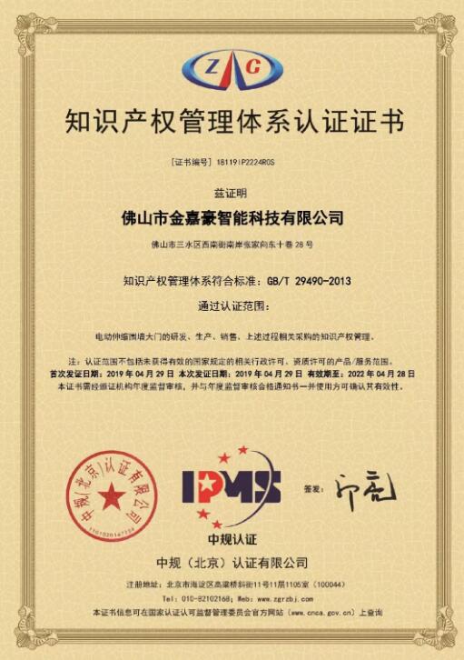 近日,佛山市金嘉豪智能科技有限公司榮獲中規(guī)(北京)認(rèn)證有限公司頒發(fā)的“知識(shí)產(chǎn)權(quán)管理體系認(rèn)證證書”,證書編號(hào):18119IP2224R0S,認(rèn)證范圍:電動(dòng)伸縮門圍墻大門的研發(fā)、生產(chǎn)、銷售、上述過(guò)程相關(guān)采購(gòu)的知識(shí)產(chǎn)權(quán)管理。