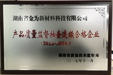 近日,湖南省質(zhì)量技術(shù)監(jiān)督局公布了2017年產(chǎn)品質(zhì)量監(jiān)督抽查連續(xù)合格企業(yè)名單,湖南省金為新材料科技有限公司秉承“安全源于品質(zhì),創(chuàng)新只為安全”的經(jīng)營理念,以優(yōu)質(zhì)、安全的產(chǎn)品,榮獲“產(chǎn)品質(zhì)量監(jiān)督抽查連續(xù)5年(2012-2016)合格企業(yè)”。