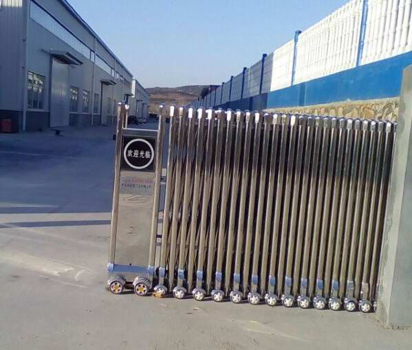青島出安智能電動(dòng)伸縮門(mén)就是門(mén)體可以伸縮自由移動(dòng),來(lái)控制門(mén)洞大小、來(lái)控制行人或車輛的攔截和放行的一種門(mén)。伸縮門(mén)主要由門(mén)體、驅(qū)動(dòng)電機(jī),滑道、控制系統(tǒng)構(gòu)成。門(mén)體采用優(yōu)質(zhì)不銹鋼及鋁合金專用型材制作,采用平行四邊形原理鉸接,伸縮靈活行程大。驅(qū)動(dòng)器采用特種電機(jī)驅(qū)動(dòng),蝸桿蝸輪減速,并設(shè)有自動(dòng)離合或手動(dòng)離合器,自動(dòng)離合停電時(shí)可自動(dòng)啟閉,手動(dòng)離合停電時(shí)可手動(dòng)啟閉,控制系統(tǒng)有控制板,按鈕開(kāi)關(guān),另可根據(jù)需求配備無(wú)線遙控裝置。可配備滾動(dòng)顯示屏,顯示300-500字的顯示內(nèi)容。還可配備智能紅外線探頭防碰撞裝置,遇人或異物20-30CM可自動(dòng)返回運(yùn)行,從而保障車輛及行人的安全。伸縮門(mén)適用于工礦企業(yè)、機(jī)關(guān)院校、娛樂(lè)場(chǎng)所、賓館飯店等公共場(chǎng)合。