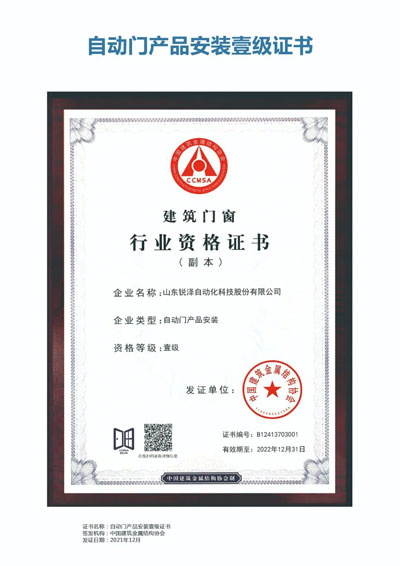 守匠于心,精進于行,二十年潛心積淀,銳澤正一步一個腳印發(fā)展壯大。自動門產(chǎn)品制造、安裝雙壹級資質(zhì)的取得,既是肯定和認可,同時也是激勵與鞭策。未來,我們將不斷研發(fā)創(chuàng)新,深化服務,延伸品牌影響力,推進企業(yè)實現(xiàn)更大的發(fā)展!