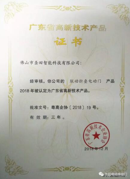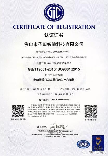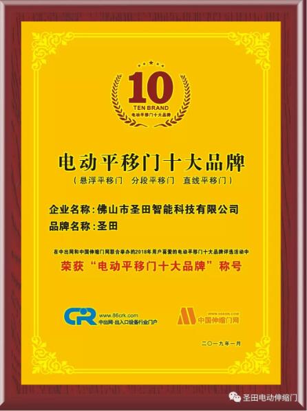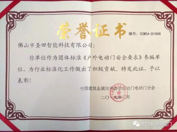 熱烈祝賀圣田智能科技榮獲《戶外電動(dòng)門安全要求》