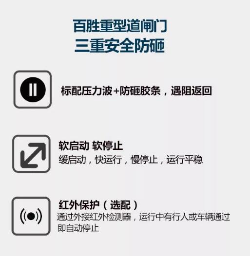 重型道閘門宜安裝壓力防砸或紅外防碰裝置,在升降過程中檢測到障礙物信號時可自動返回到一定距離或停止,以有效的保護過往人員、物體及車輛。