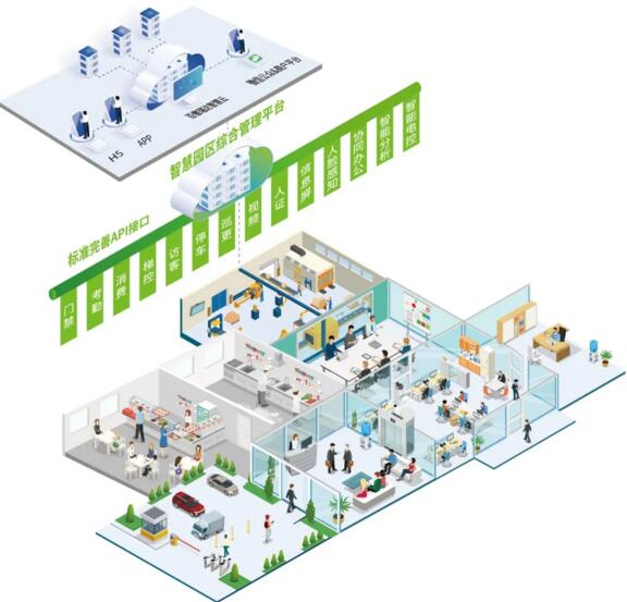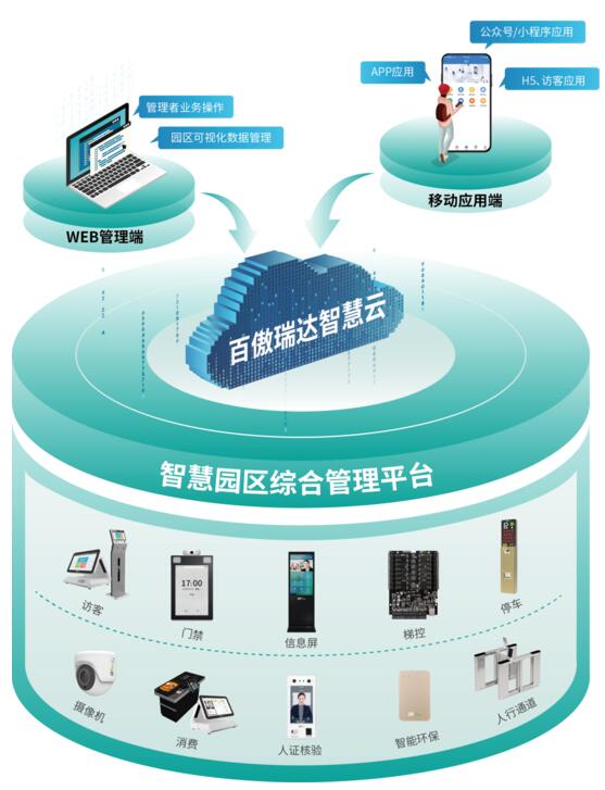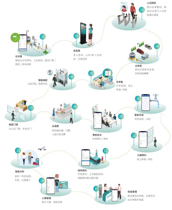 圍繞移動端、云端、管理端、設(shè)備終端打造訪客、消費、考勤、停車等應(yīng)用場景。